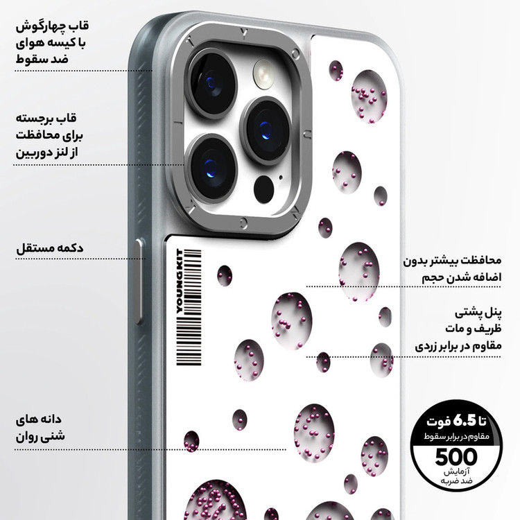 برند یانگکیت ، برندی که در مدت زمان کوتاهی توانسته در دل آیفون داران جا باز کند! قابهای YOUNGKIT بواسطه طراحی جدید و بسته بندی خاص خود در شبکه های اجتماعی ترند شدند و بازار خوبی برای خود بوجود آوردند. بسته بندی قاب های یانگ کیت شدیدا برای هدیه دادن مناسب هستند و قطعا طراحی چشم نواز آن ها ، عزیزانتان را شگفت زده میکند. قابها از پلاستیک بسیار نرم و باکیفیت تشکیل شده اند. دکمه های نرم و روان و برش های لیزری دقیق جزو مزایای دیگر این سری قابهای برند یانگ کیت میباشد. اصلی ترین دلیل تفاوت قاب های یانگ کیت ، طراحی متفاوت و خاص آن هاست ؛ طراحی که شاید در دست هر آیفون داری نبینید!! همین امر باعث میشود تا داشتن این قاب شما را از آیفون داران دیگر متمایز کند. ضربه گیری خوب و طراحی مهندسی شده و حرفه ای از مزایای دیگر قاب یانگ کیت هستند. در داخل قاب طراحی بصورت شیار شیار انجام شده تا هوا به سادگی رد و بدل شود و از داغ شدن دستگاه جلوگیری کند. متریال استاندارد این قاب موجب شده تا هیچگونه اختلالی در آنتن دهی بوجود نیاید و با خیال راحت میتوانید از این قاب استفاده کنید. بصورت کلی اگر بدنبال یک قاب حرفه ای ، با کیفیت و طراحی خاص هستید قطعا قاب های یانگ کیت را به شما توصیه میکنیم.