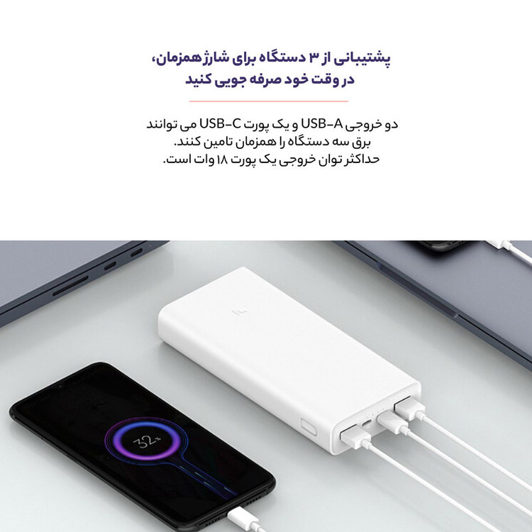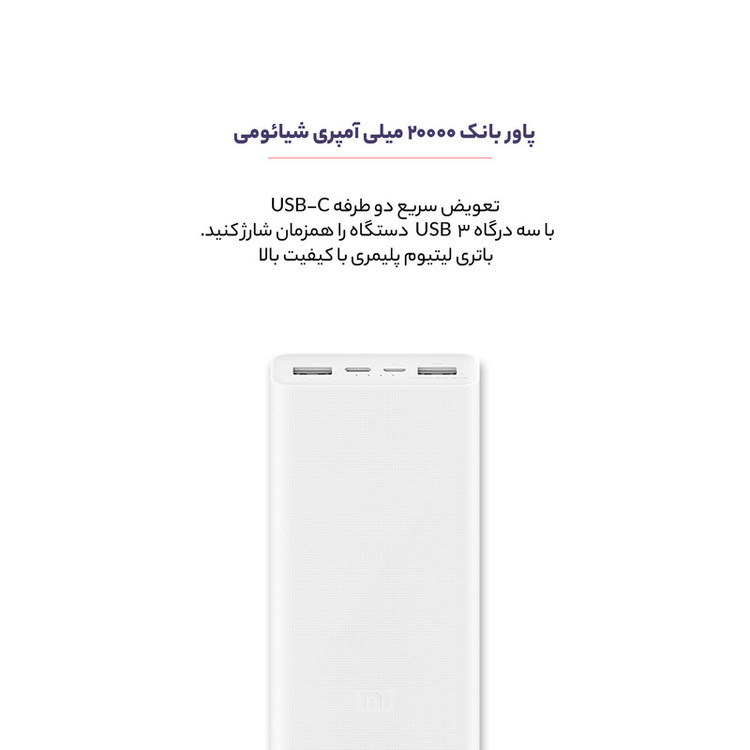 شیائومی یکی از برترین برندهای پاوربانک در جهان است. پاوربانک های این شرکت از حیث قیمت، کارایی بالاتری دارند. همین مسئله علاوه بر طول عمر بالای این محصولات سبب محبوبیت بسیار بالای پاوربانک های شیائومی میان مردم شده است. یکی از محبوبترین پاوربانک های این شرکت، سری Mi PowerBank است که بعنوان اصلی ترین مدل پاوربانک شیائومی شناخته می شود. سالانه نیز نسخه ای جدید از آن به بازار عرضه می شود. امسال نیز ورژن سوم این پاوربانک با نام Xiaomi Mi PowerBank 3 ارائه شده است که قابلیت های بهتری را نسبت به قبل به کاربر ارائه می دهد. پاوربانک شیائومی Xiaomi Mi PowerBank 3 دارای دو پورت خروجی یو اس بی می باشد که هرکدام شدت جریان و ولتاژ معادل 2 آمپر / 5 ولت دارد. همچنین این پورت ها دارای قابلیت شارژ دستگاه های شما با توان 18 وات را دارد. هرکدام از پورت های یو اس بی می توانند بصورت جداگانه تا توانی معادل 18 وات را به گوشی شما انتقال دهند. همچنین به علت داشتن چیپست هوشمند داخل این پاوربانک، با اتصال دستگاه های خود به پاوربانک ورژن 3 شیائومی، خیالتان از انتقال جریان بیش از حد به دستگاهتان راحت است. زیرا این چیپست توان مورد نیاز دستگاه را تشخیص و می تواند حداکقر تا 2A/5V توان و جریان خروجی داشته باشد. همچنین شیائومی از موج جدید راه افتاده در پورت ها، یعنی پورت Type-C عقب نمانده و علاوه بر پورت مرسوم Micro USBیک پورت تایپ سی نیز جهت شارژ پاوربانک روی آن تعبیه کرده است. علاوه بر شارژ اینکه پورت تایپ سی قرار گرفته روی پاوربانک قابلیت خروجی دارد توانایی شارژ خود پاوربانک با توان 18 وات را نیز دارد. از دیگر قابلیت هایی که شیائومی برای مدل Xiaomi Mi Power Bank 3 PLM18ZM قرار داده، استفاده از قابلیت QC3 یا همان شارژ سریع است که در هر سه پورت خروجی گنجانده شده و می توان به راحتی از آن استفاده کرد. علاوه بر این با دوبار فشردن کلید پاوربانک، وارد مود ولتاژ پایین خواهید شد و می توانید ساعت هوشمند و هندزفری های خود را نیز با خیال راحت با آن شارژ کنید.