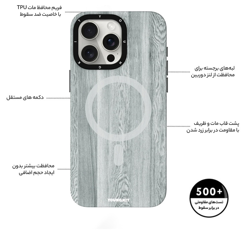 این محصول از جنس TPU باکیفیت و مقاوم در برابر ضربه می باشد. سطح روی قاب مات می باشد بافت چوب بر روی آن شبیه سازی شده است که باعث می شود اثر انگشت بر روی آن باقی نماند. لبه های نرم و برآمده محافظت بیشتری از صفحه نمایش در برابر هرگونه شکستگی و خط و خش ایجاد میکند . همچنین برآمدگی محافظ لنز آن، دوربین گوشی را در ایمنی کامل قرار می دهد. طراحی دکمه ها آنچنان دقیق است که کار با گوشی را برای کاربر آسان کرده است و به گفته اکثر استفاده کنندگان نرم ترین دکمه های موجود در بین قاب های آیفون با برند های مختلف می باشد و به لطف برش دقیق دسترسی به پورتهای گوشی برای کاربر آسان می باشد. این محصول با کیفیت بالا و با استفاده از تکنولوژی IMD ( چاپ دولایه ) نه تنها در برابر خط و خش مقوام است بلکه در مقابل سایش هم مقوام می باشد و همچنین رنگ محصول ثابت می باشد. مگ سیف این محصول با فناوری مکش مغناطیسی قوی و استاندارد خیال شما را از شارژ با مگ سیف راحت می کند. قابهای YOUNGKIT بواسطه طراحی جدید و بسته بندی خاص خود در شبکه های اجتماعی ترند شدند و بازار خوبی برای خود بوجود آوردند. بسته بندی جدید این سری از قاب های یانگ کیت بسیار زیبا و با کیفیت می باشد و شدیدا برای هدیه دادن مناسب هستند و قطعا طراحی چشم نواز آن ها، عزیزانتان را شگفت زده میکند. برند یانگ کیت YOUNGKIT مبتکر در طرحهای جدید و مینیمال شما را یک قدم از بقیه جلوتر نگه می دارد.